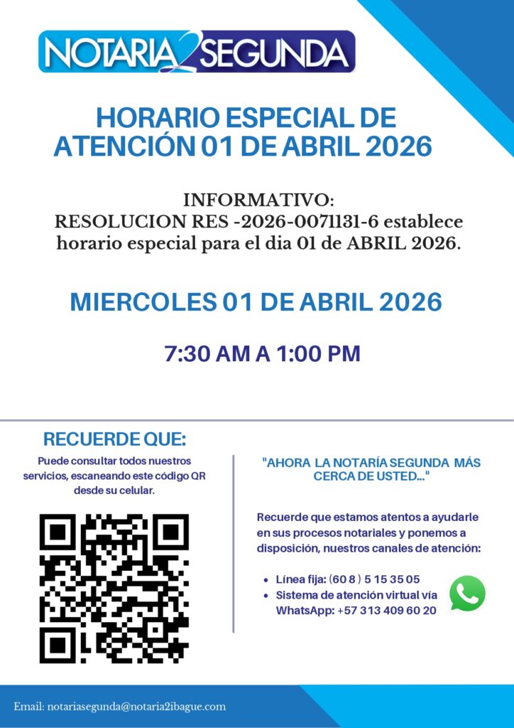 En ejercicio de sus facultades legales, y conforme a lo establecido se ha autorizado la modificación de horarios de atención en notarías durante las festividades de Semana santa el dia 01 de Abril de 2026.